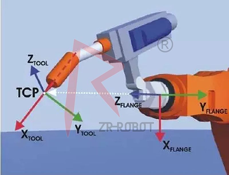 *在默認(rèn)配置中,工具坐標(biāo)系的原點(diǎn)在法蘭中心點(diǎn)上(因而被稱作法蘭坐標(biāo)系)。工具坐標(biāo)系由用戶移入工具的工作點(diǎn)。